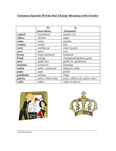 Spanish Words That Change Meaning With Gender Capital Corte Coma 2 Pages Teaching Resources