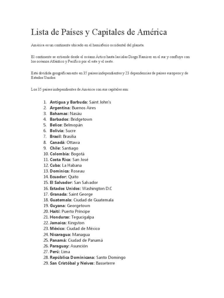 Paises Que Conforman El Continente Americano Y Sus Capitales Pdf Americas