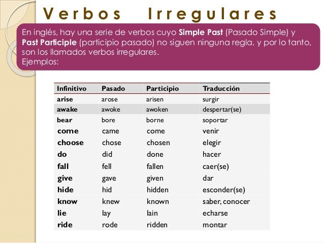 50 rows LISTA DE VERBOS IRREGULARES INFINITIVO PASADO SIMPLE PARTICIPIO PASADO ESPAÑOL Arise. Irregular verbs in the.