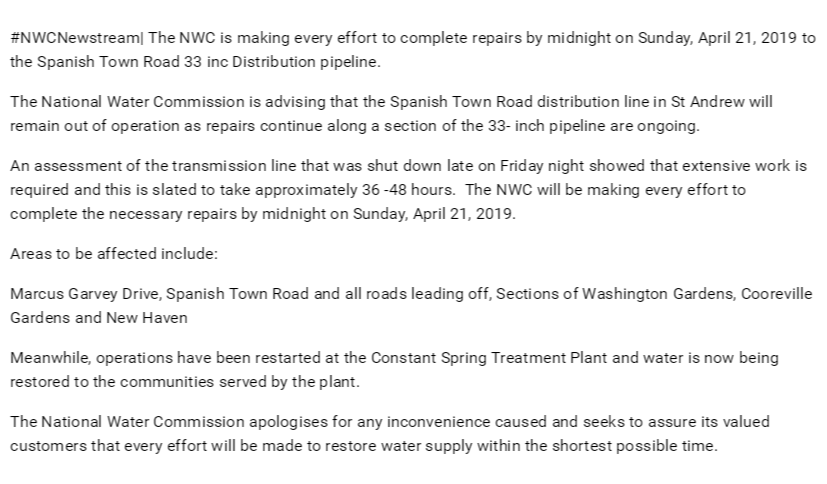Nwc Jamaica On Twitter Nwcnewstream The Nwc Is Making Every Effort To Complete Repairs By Midnight On Sunday April 21 2019 To The Spanish Town Road 33 Inc Distribution Pipeline The National