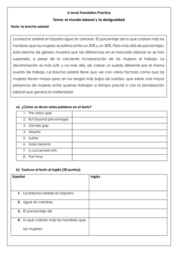 Spanish A Level Las Mujeres Y La Brecha Salarial Translations On Gender Equality Employment Teaching Resources